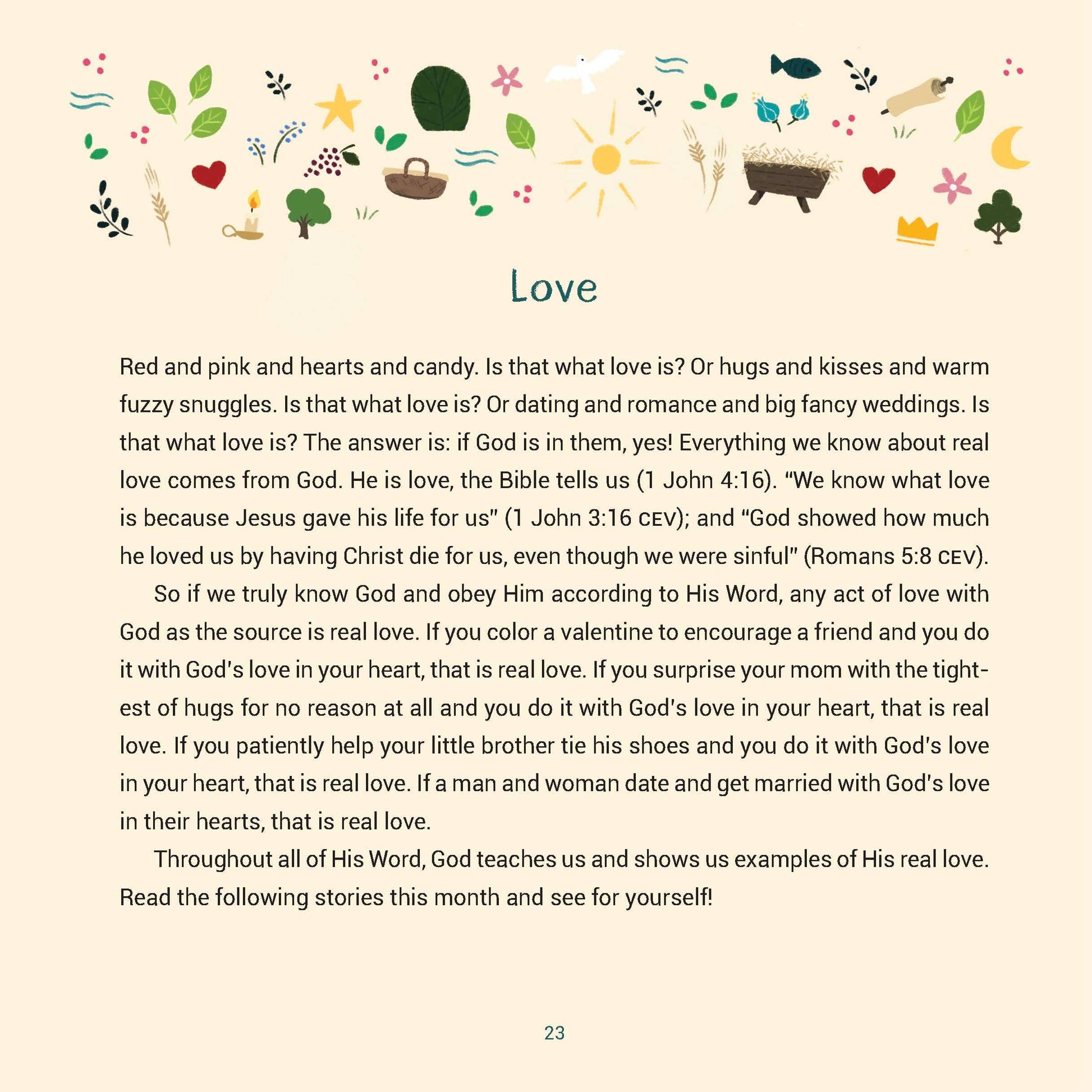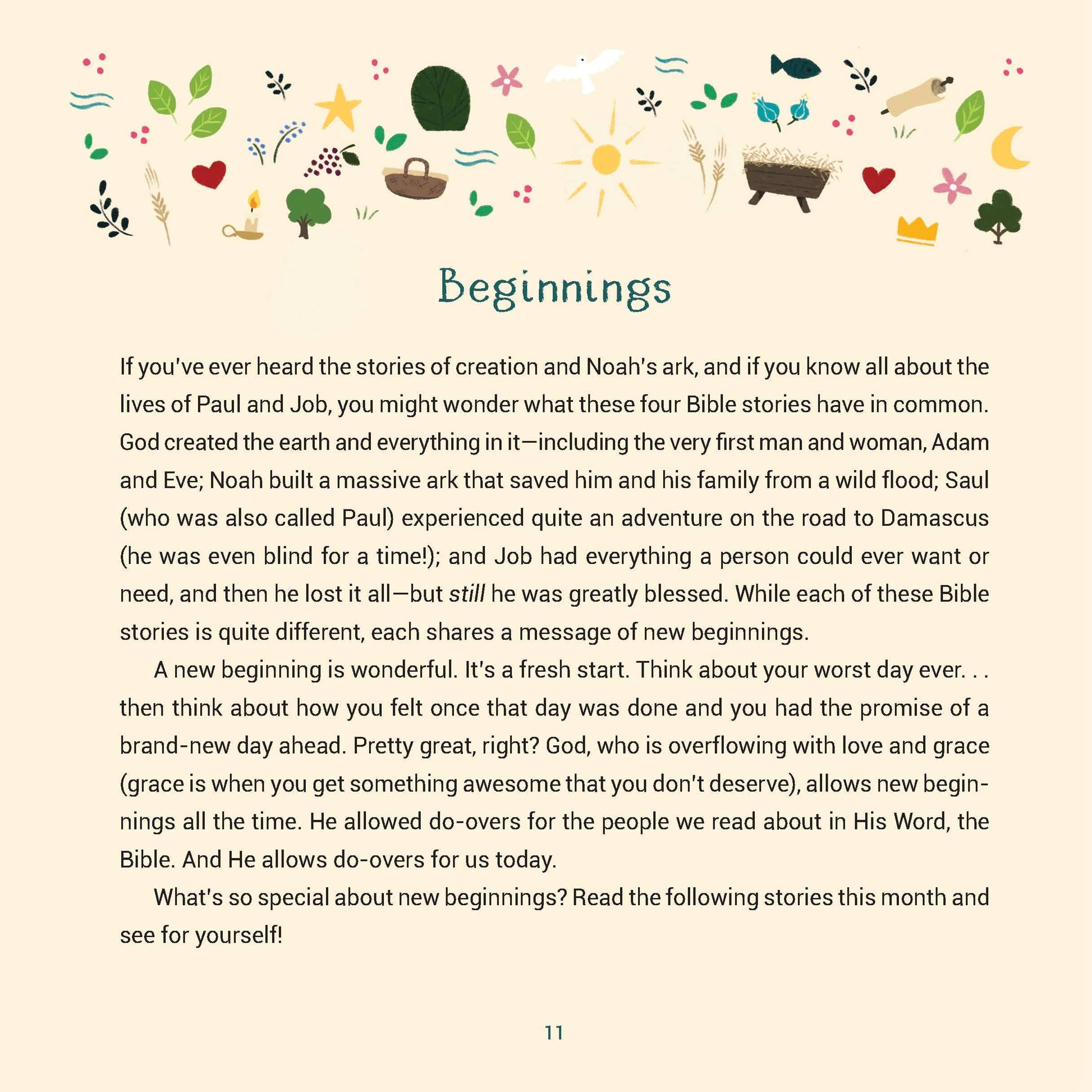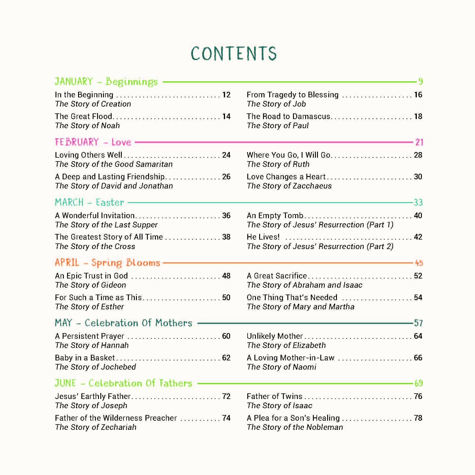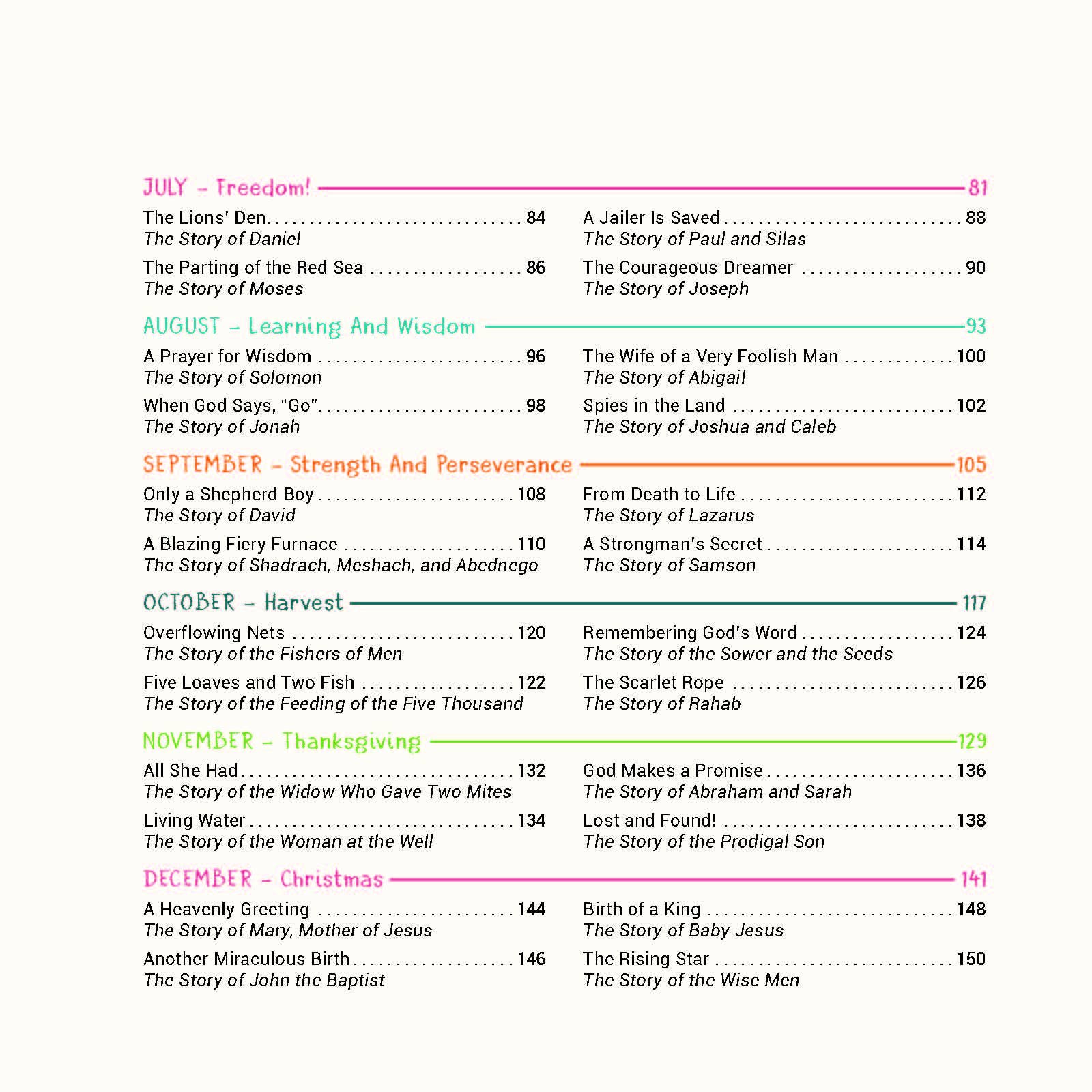 A Year of Bible Stories Is Sure to Become a Storytime Favorite in Your House! This lovely keepsake Bible storybook for kids celebrates each month of the calendar year with 48 best-loved stories from God's Word. The stories are arranged into monthly themes that relate to a specific month of the calendar year. Each section includes 4 colorfully illustrated Bible stories that reinforce the monthly theme and show kids how God worked in the lives of Bible men and women--and how He works in the lives of people today! A fun bonus section at the end of the book features a list of yearly calendar celebrations with dates and brief explanations.