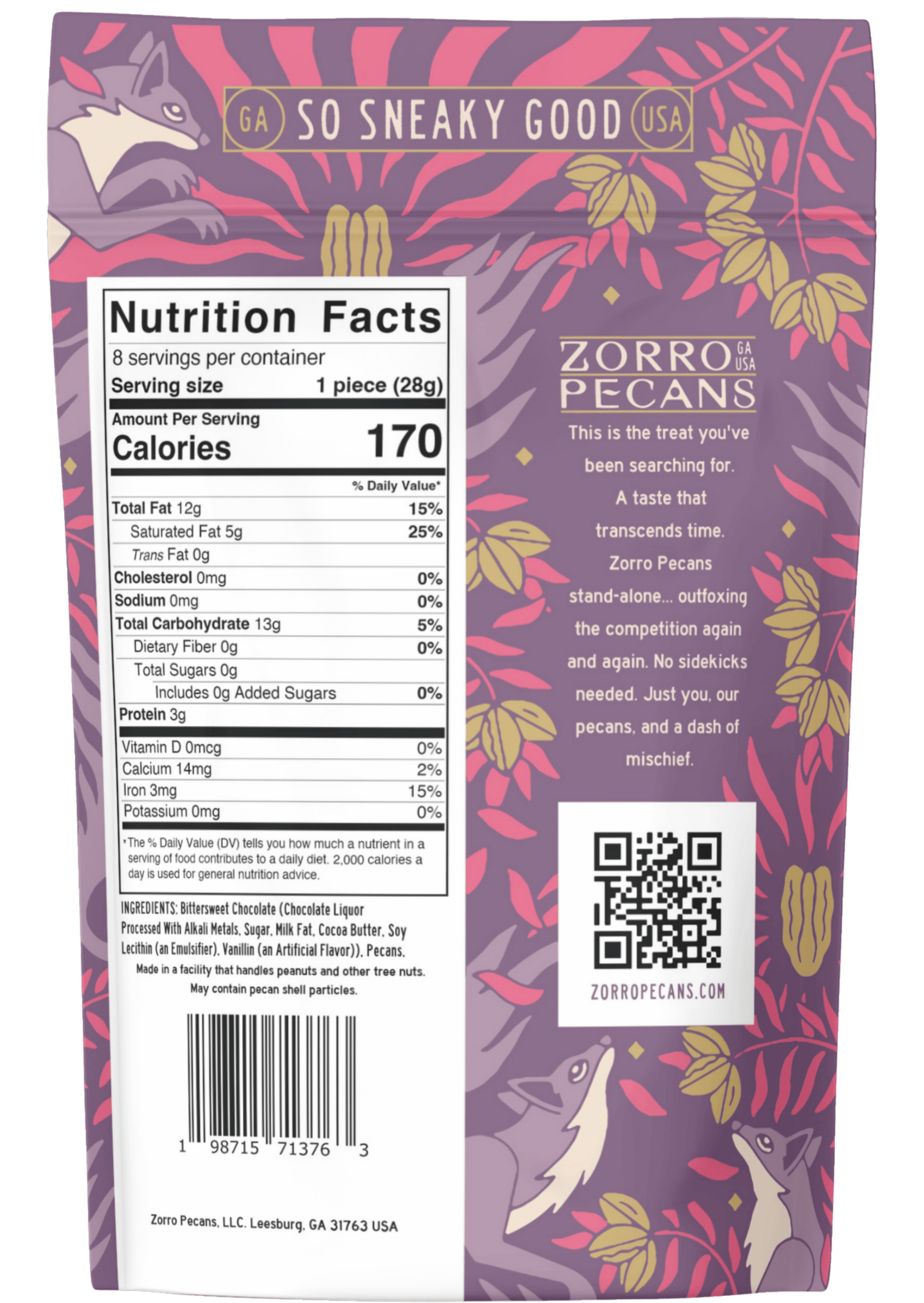 Dark Chocolate Pecan Bark...decadent, smooth chocolate and fresh crunchy pecans! Pairs beautifully on shelves with Sweet and Spicy. Each crunchy bite of Zorro Pecans is a symphony of flavor; perfect for any occasion, or no "occasion" at all!