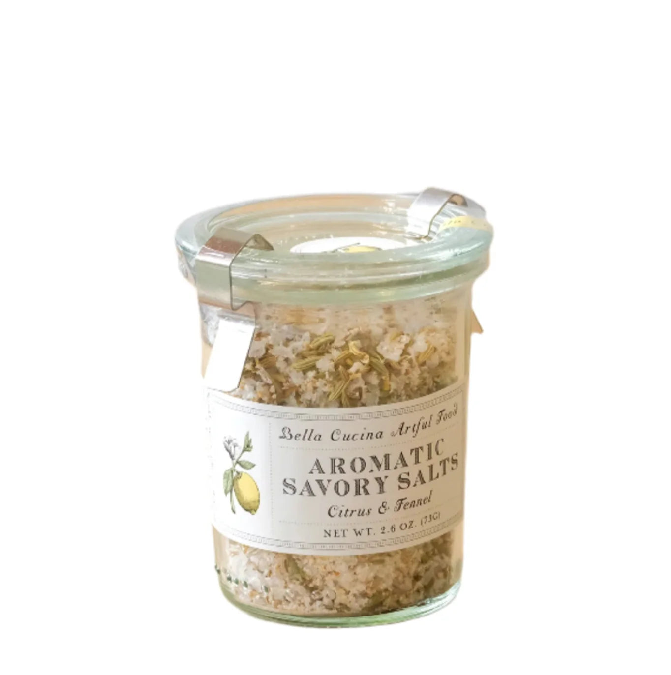 CITRUS AND FENNEL- A fresh and light combination of oven-dried citrus peel and fragrant fennel seeds are laced with flat salt crystals imported from Europe. Use the salts on chicken, fish or vegetables.